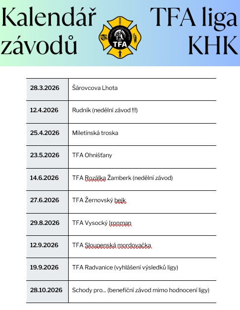 19. 12. 2025 Kalendář závodů 2026 Podívejte se na kalendář závodů zařazených do TFA ligy Královéhradeckého kraje pro rok 2026